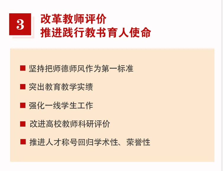 9.坚持把师德师风作为第一标准。坚决克服重科研轻教学、重教书轻育人等现象,把师德表现作为教师资格定期注册、业绩考核、职称评聘、评优奖励首要要求,强化教师思想政治素质考察,推动师德师风建设常态化、长效化。健全教师荣誉制度,发挥典型示范引领作用。全面落实新时代幼儿园、中小学、高校教师职业行为准则,建立师德失范行为通报警示制度。对出现严重师德师风问题的教师,探索实施教育全行业禁入制度。