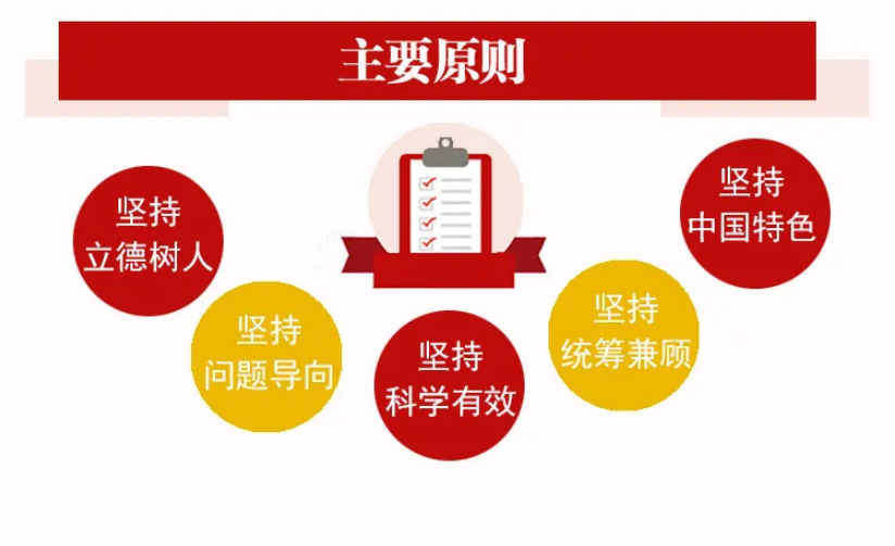 (二)主要原则。坚持立德树人,牢记为党育人、为国育才使命,充分发挥教育评价的指挥棒作用,引导确立科学的育人目标,确保教育正确发展方向。坚持问题导向,从党中央关心、群众关切、社会关注的问题入手,破立并举,推进教育评价关键领域改革取得实质性突破。坚持科学有效,改进结果评价,强化过程评价,探索增值评价,健全综合评价,充分利用信息技术,提高教育评价的科学性、专业性、客观性。坚持统筹兼顾,针对不同主体和不同学段、不同类型教育特点,分类设计、稳步推进,增强改革的系统性、整体性、协同性。坚持中国特色,扎根中国、融通中外,立足时代、面向未来,坚定不移走中国特色社会主义教育发展道路。