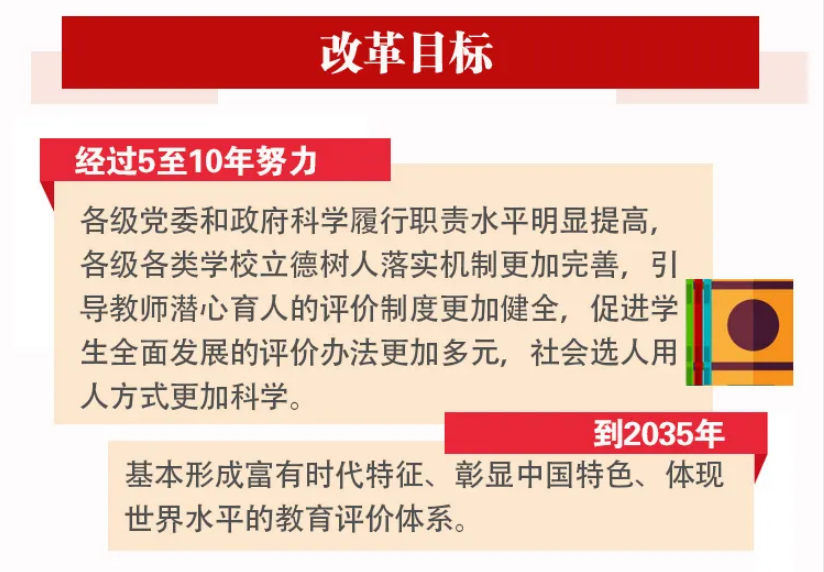 (三)改革目标。经过5至10年努力,各级党委和政府科学履行职责水平明显提高,各级各类学校立德树人落实机制更加完善,引导教师潜心育人的评价制度更加健全,促进学生全面发展的评价办法更加多元,社会选人用人方式更加科学。到2035年,基本形成富有时代特征、彰显中国特色、体现世界水平的教育评价体系。