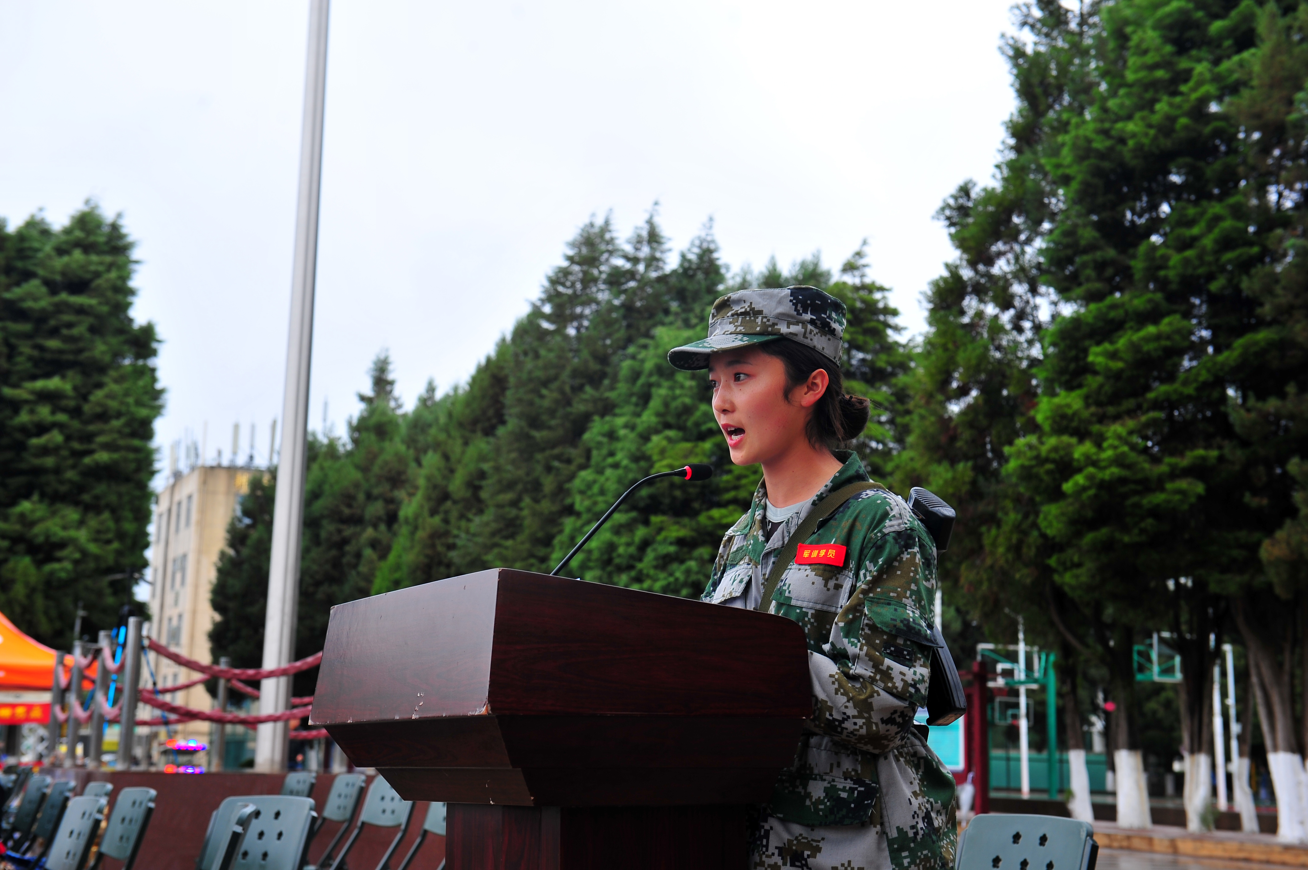 表彰结束后由军训优秀学员代表刘文婷发言,她表示在十五天的军训中收获了成长和喜悦,也收获了团结和友谊。在今后的学习和生活中,将继续发扬军训中不怕苦不怕累的艰苦朴素的精神来面对三年大学生活。