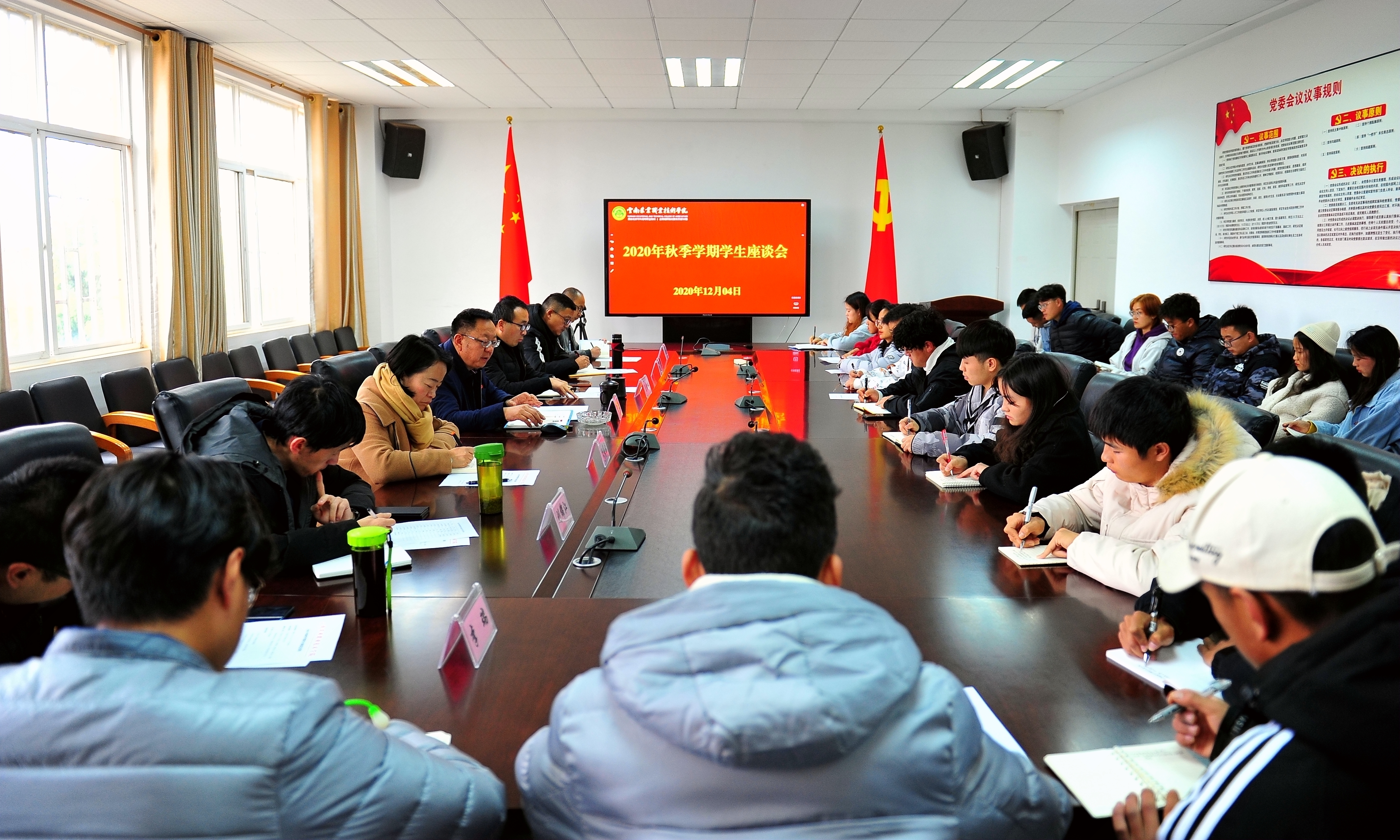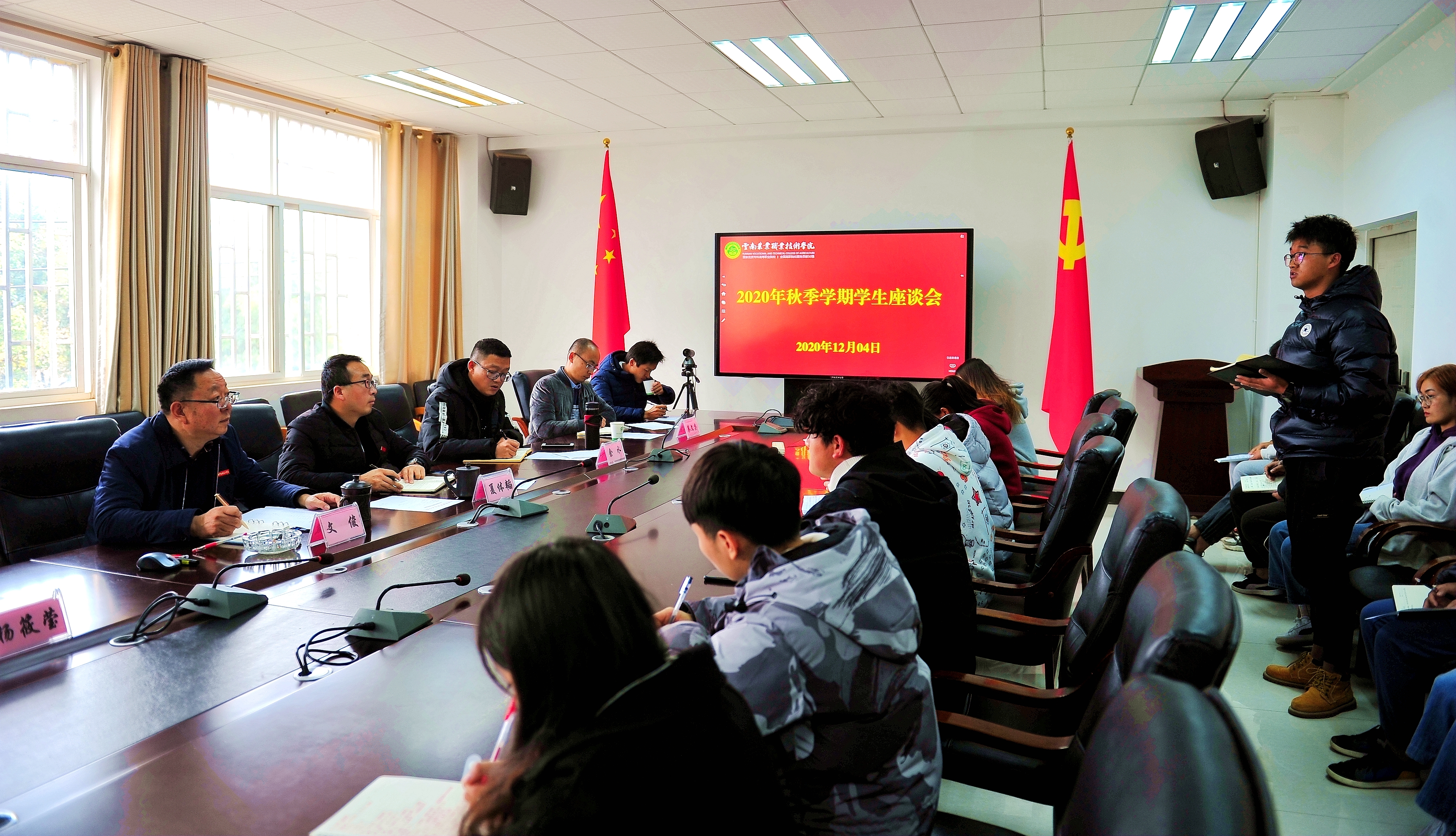 通知中心12月4日下午,学院在小哨校区四楼会议室召开2020年秋季学期学生座谈会,文俊院长出席座谈会,宣传部、学生处、教务处、团委、后勤管理服务中心、现代教育技术与信息中心等有关部门负责人和25名学生代表参加,座谈会由党委委员,办公室(党委巡察办)主任夏体韬主持。