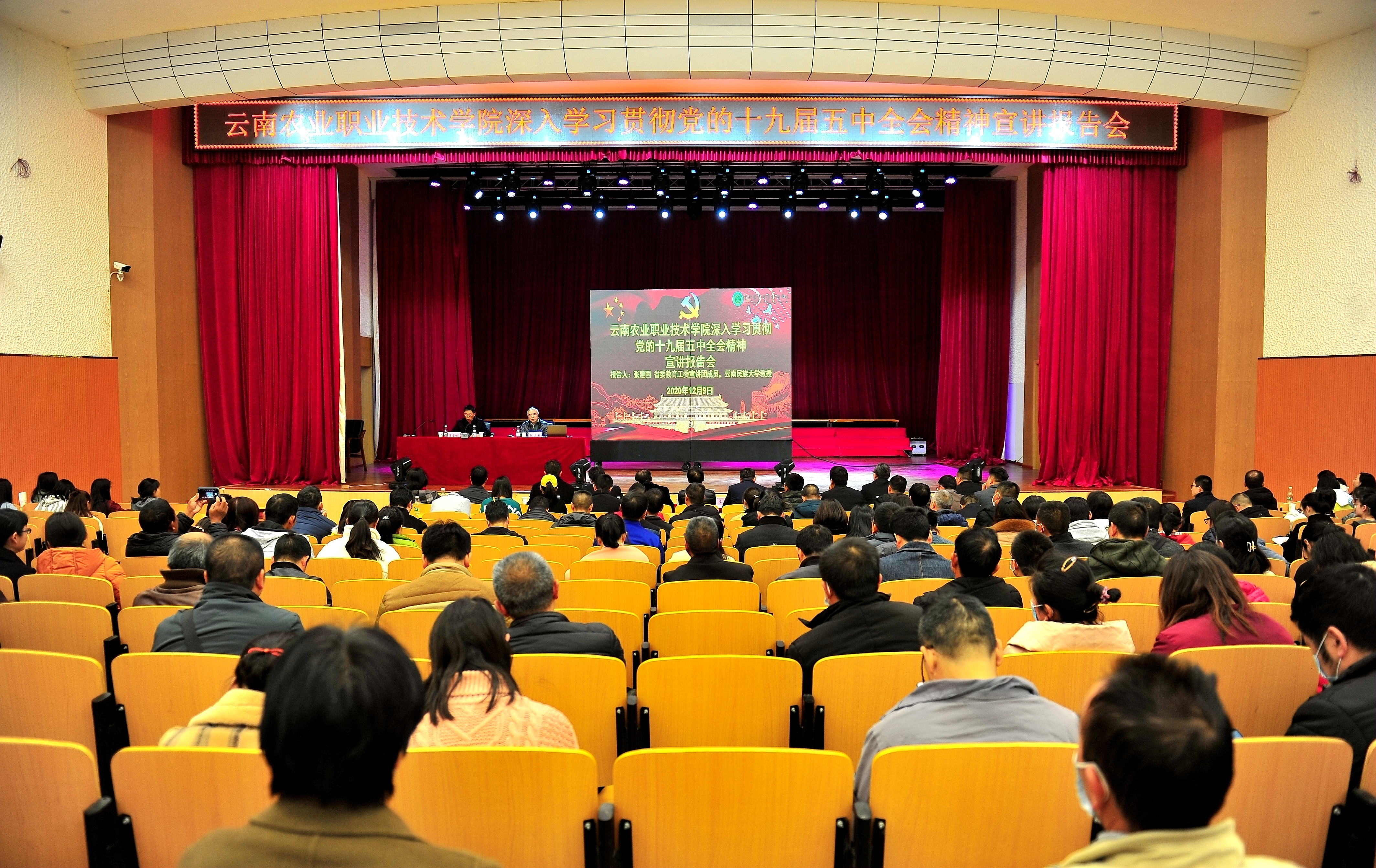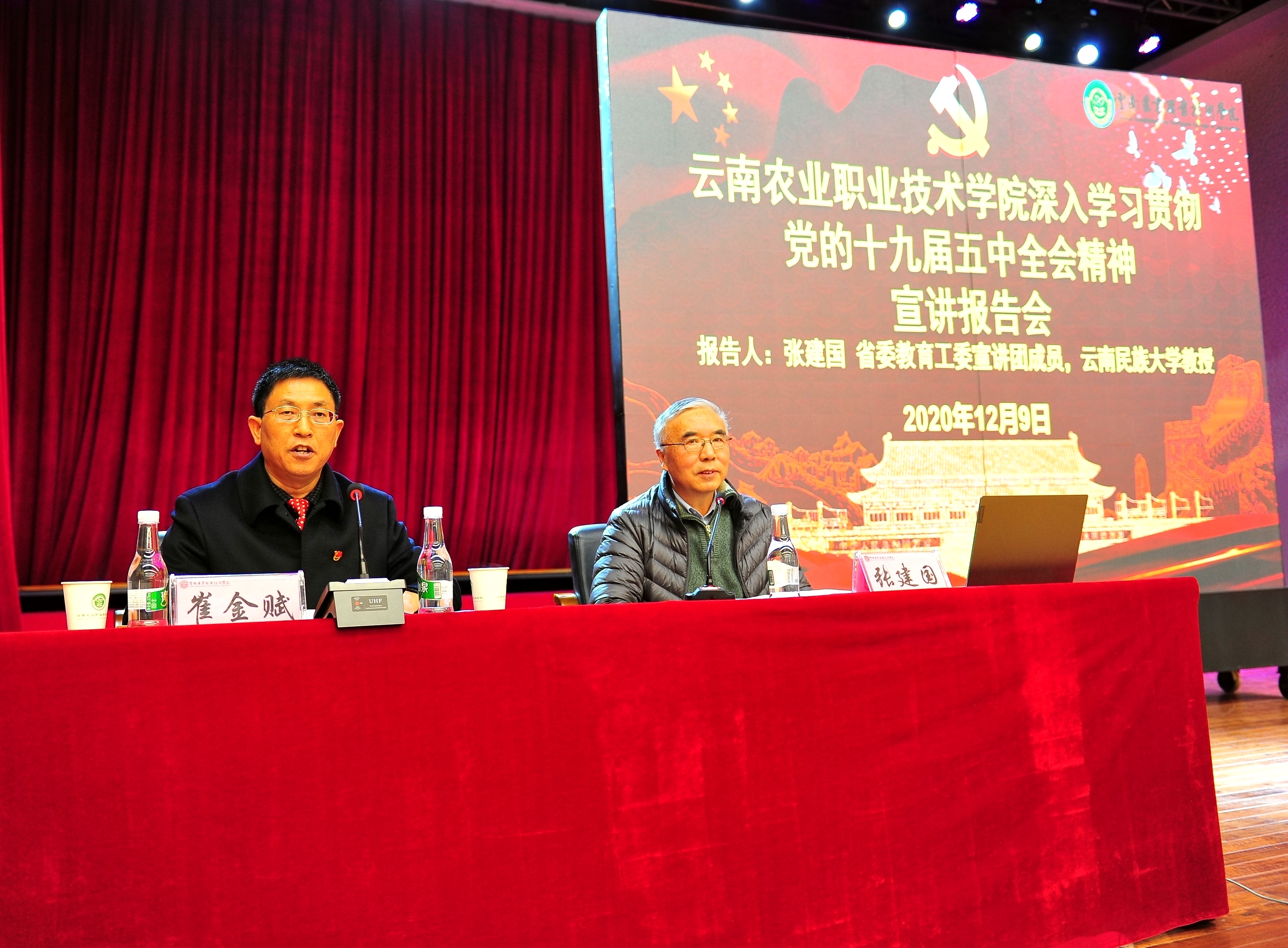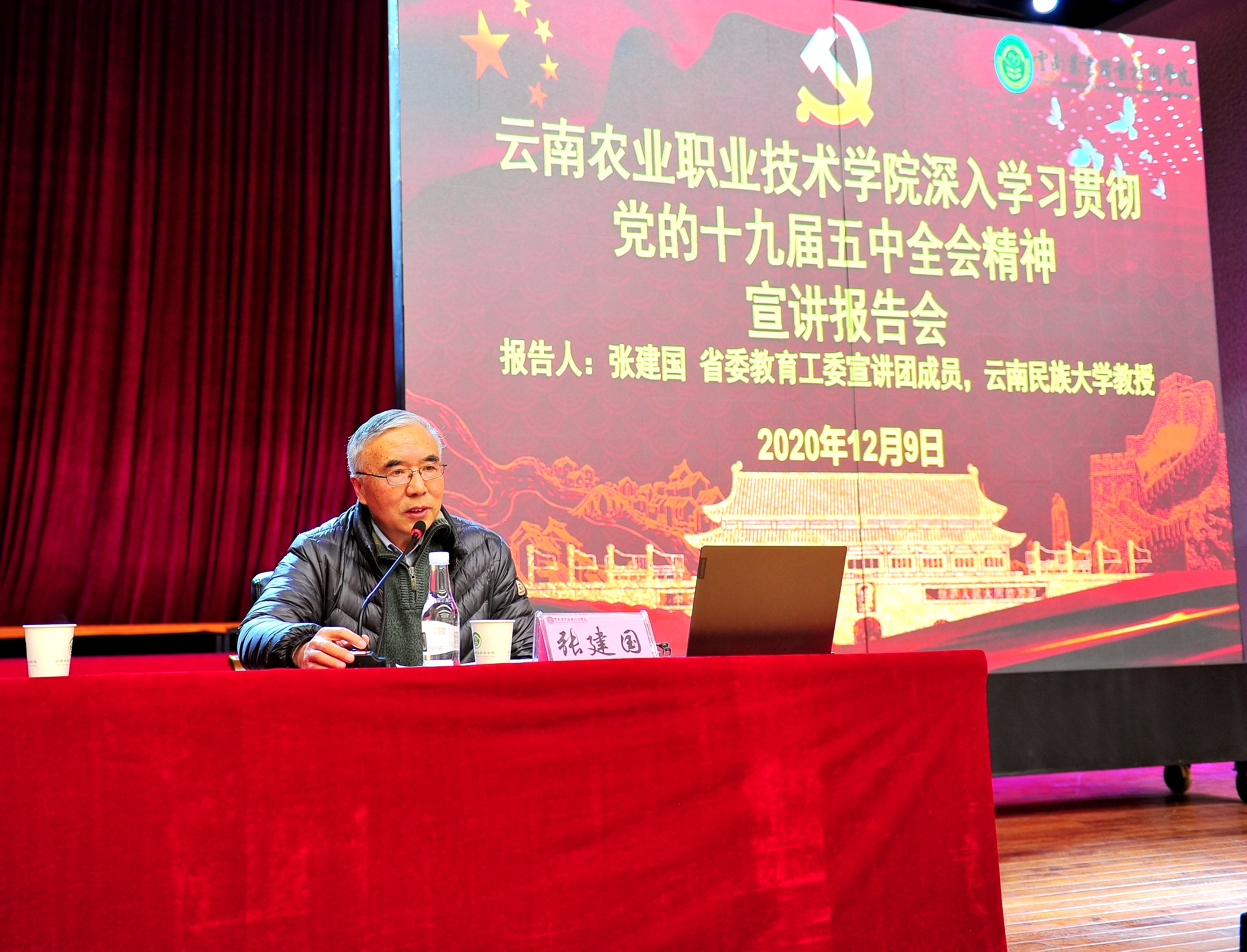 12月9日下午,我院在小哨校区蚕桑礼堂召开深入学习贯彻党的十九届五中全会精神宣讲报告会。省委教育工委宣讲团成员、中央马克思主义理论研究和建设工程高校思想政治理论课教材编写课题组首席专家、云南民族大学马克思主义学院张建国教授应邀作宣讲报告。党委书记崔金赋同志;党委副书记、院长文俊同志;党委委员、纪委书记冯志宏同志;党委委员、副院长雷衡同志;党委委员、副院长苏华伟同志;党委委员、马克思主义学院党总支书记张建才同志;党委委员、组织部、统战部部长王军明同志;党委委员、办公室(党委巡察办)主任夏体韬同志;党建共建合作院校、昆明卫生职院党委副书记张晓刚同志;党委委委员、副院长、组织部部长周平同志出席宣讲报告会。全体教职工以及青马班学生约600人;昆明卫生职业学院部分师生代表约20人共同聆听了报告。学院党委书记崔金赋同志主持报告会。