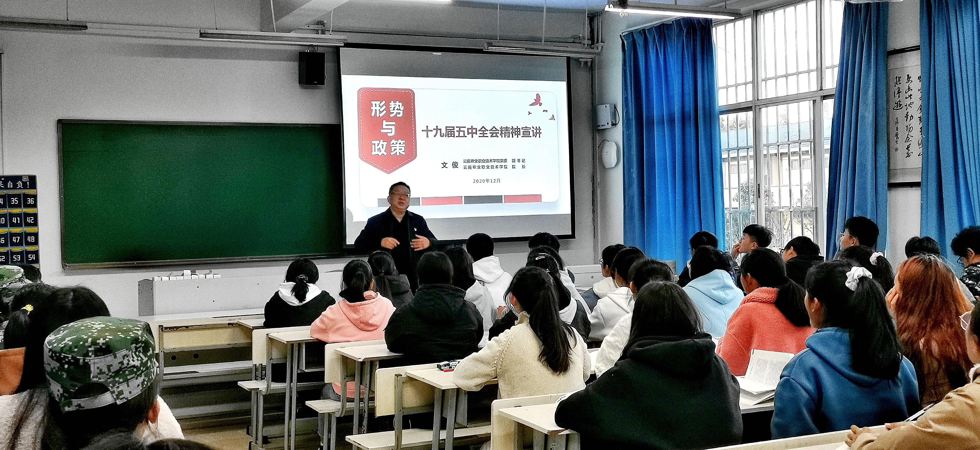 文俊院长从党的十九届五中全会及《“十四五”规划建议》的主要内容、如何看待大变局下的“中国故事”、按照习近平总书记的指示谋划“云南跨越发展”、如何书写五中全会背景下的“农职篇章”等几方面为同学们进行了讲授和辅导。