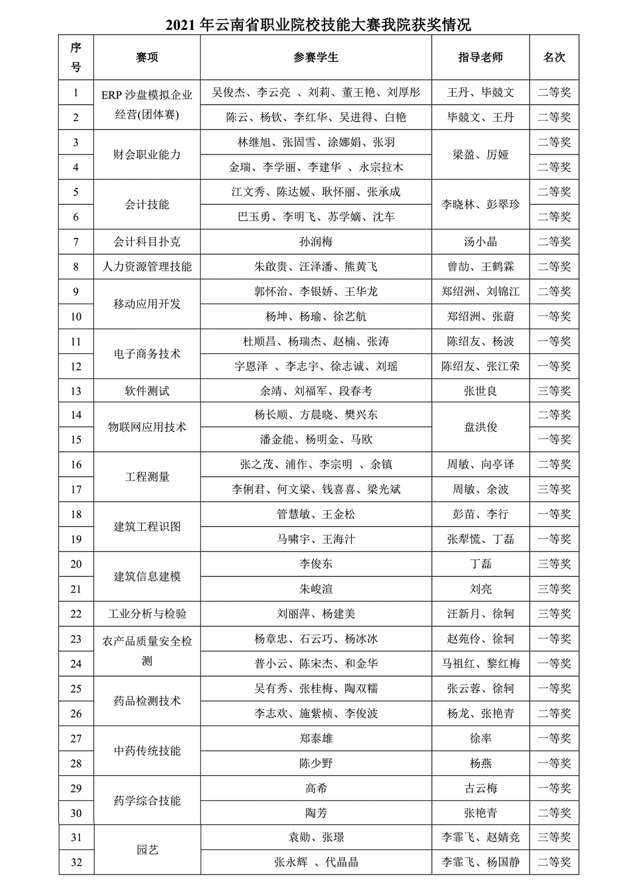 通知中心近日,由云南省教育厅主办的“2021年云南省职业院校技能大赛”落下帷幕。在本次技能大赛中,我院组织了44名指导教师、108名学生共参加了22个赛项,荣获一等奖12个,二等奖13个,三等奖6个。具体获奖情况见下表。