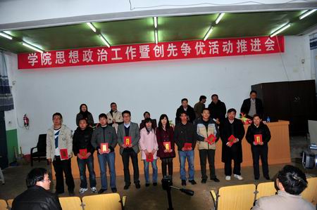 2011年3月26日,室外春寒料峭、阴雨绵绵,学院小哨校区阶梯教室则春意浓浓,学院“思想政治工作暨创先争优活动推进会议”在这里隆重召开。学院党委书记崔金赋、院长彭志远、党委副书记赵刚、副院长何明东、赵莉、俞浩,以及学院正科级以上领导干部、学院党委办公室、组织部、宣传部、学生工作处(部)、思想政治理论教学部全体干部职工、学院全体辅导员及班主任共150余人出席了会议,彭院长主持会议。