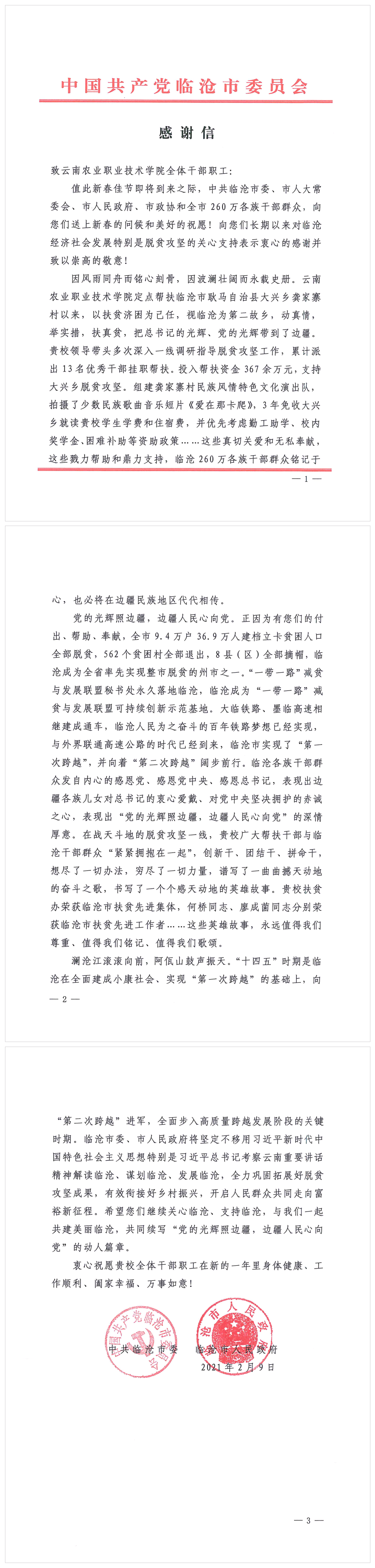 通知中心牛年新春来临之际,一封满载临沧市委、市政府和干部群众深情厚谊的感谢信翩然而至。脱贫攻坚路上风雨同舟的岁月令人难忘,脱贫攻坚来之不易的成果令人振奋。感谢2015年以来,学院15名驻村工作队员肩负光荣的职责和使命,舍“小”家、顾“大“家,在距离昆明600多公里的临沧市大兴乡龚家寨村默默付出和辛勤工作。临沧人民的真诚感谢和殷殷期盼,让我们奋进的脚步更加坚定。学院将坚定不移贯彻党中央决策部署,充分发挥好高等职业教育在脱贫攻坚战中的重要作用,为临沧市巩固拓展脱贫攻坚成果同乡村振兴有效衔接作出应有的贡献。(党委宣传部/文/图:唐丽群/审核:杨筱莹/责任编辑:普仲凯)