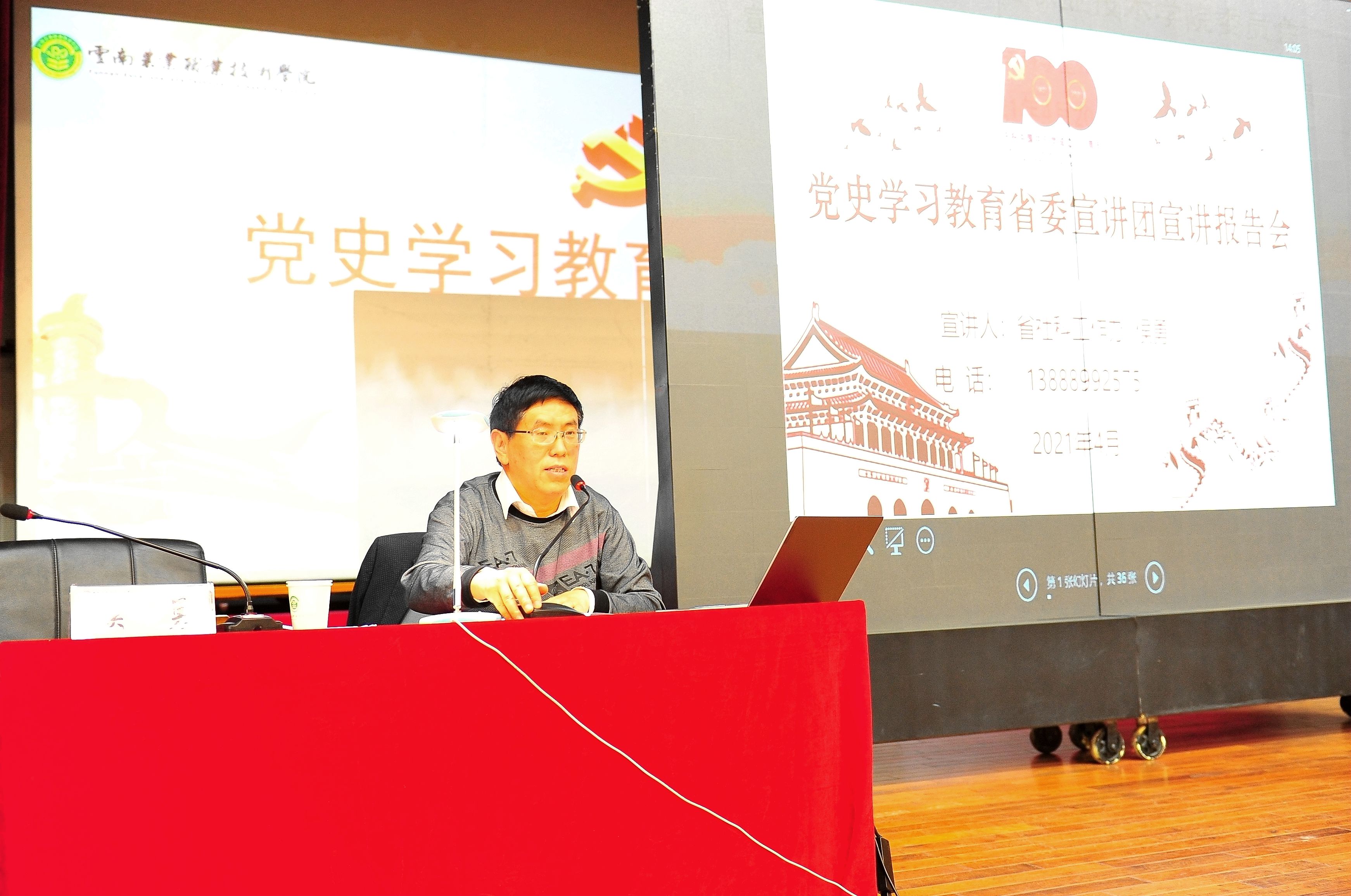 侯勇老师从充分认识开展党史学习教育的重大意义、全面了解中国共产党百年奋斗的光辉历程和历史性贡献、深刻把握学习好党史学习教育的重点、从党的百年奋斗史中汲取奋进新征程的强大力量、为云南开创全面建设社会主义现代化新局面不懈奋斗等五个方面作了精彩的宣讲。候勇老师指出,在中国共产党百年华诞的重大时刻和“两个一百年”奋斗目标历史交汇的关键节点,全省各族人民要更加紧密地团结在以习近平同志为核心的党中央周围,以昂扬姿态奋力开启全面建设社会主义现代化国家新征程,以优异成绩迎接建党100周年!