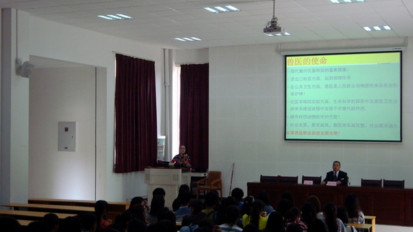 教研室王锐老师分层次从不同的角度以详实的内容及丰富多彩的图片对美丽小哨航空城、畜牧城、职教园区独特的地理位置作了介绍、又饱含深情地向同学们诉说了best365中国官方网站古老而年轻的办学历程;骄傲而自豪地介绍畜牧兽医学院和自始自终以“兽医、兽医永争第一”为口号的兽医专业群;末了,让事实说话,对兽医专业群的四大王牌专业-----兽医专业、兽医与兽药专业、动物防疫与检疫专业、宠物养护与疫病防治专业作了剖析,特别是按国际惯例对官方兽医、执业兽医、乡村兽医都一一作了说明。一桩桩、一件件鲜活的事例打动了同学们的心,同学们听看《兽医之歌》视频引发了共鸣。