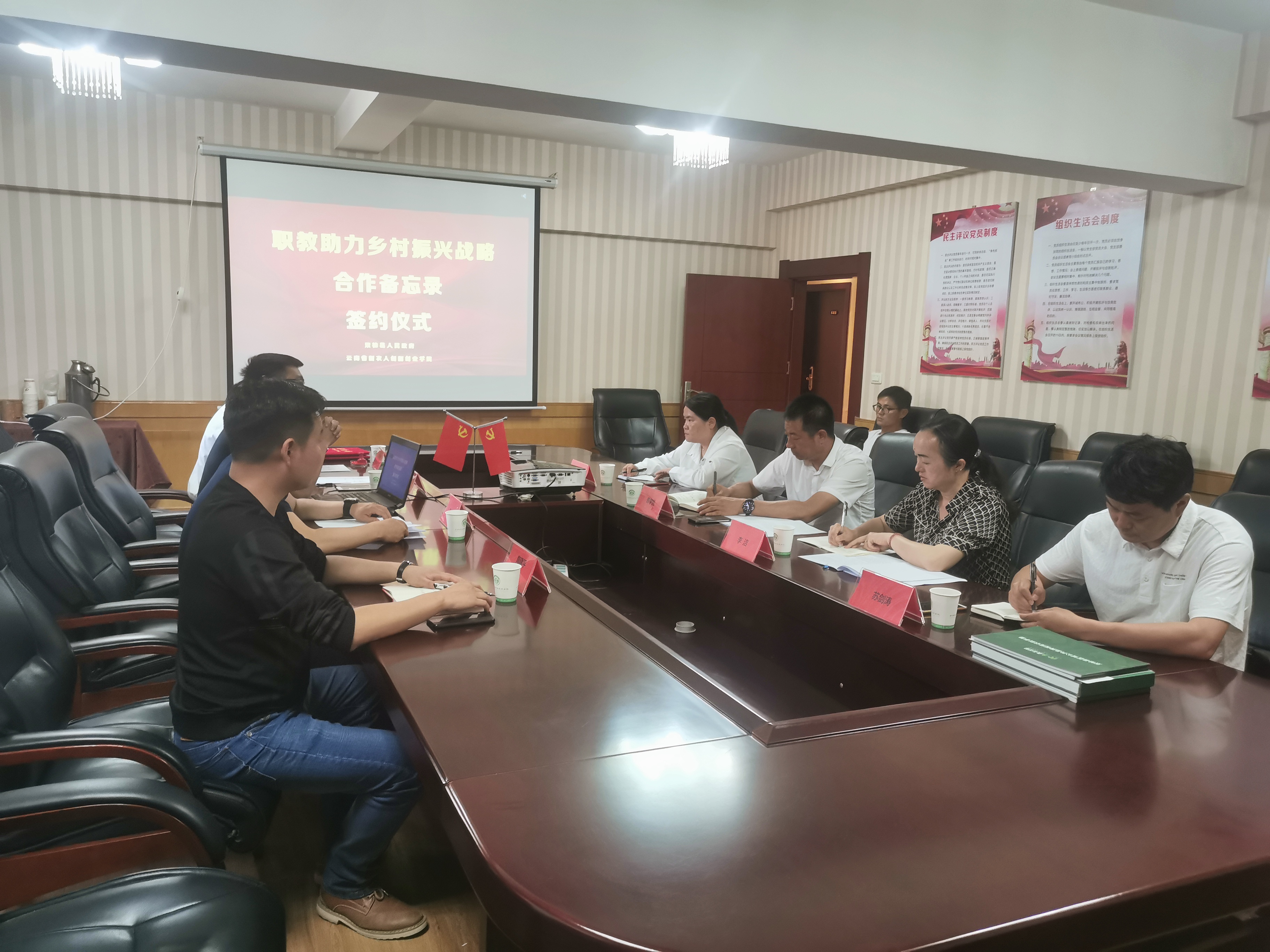 签约仪式后,双柏县人民政府副县长普学昌、双柏县农业农村局党委书记李洁 、我院继续教育与培训学院院长、农培中心主任郑绍洲、云南省新农人创新创业学院名誉院长孙立刚、执行院长王亚楠等人就“职教助力乡村振兴战略”进行了交流和讨论。