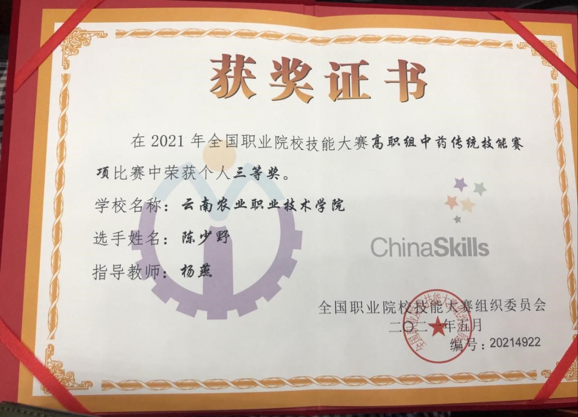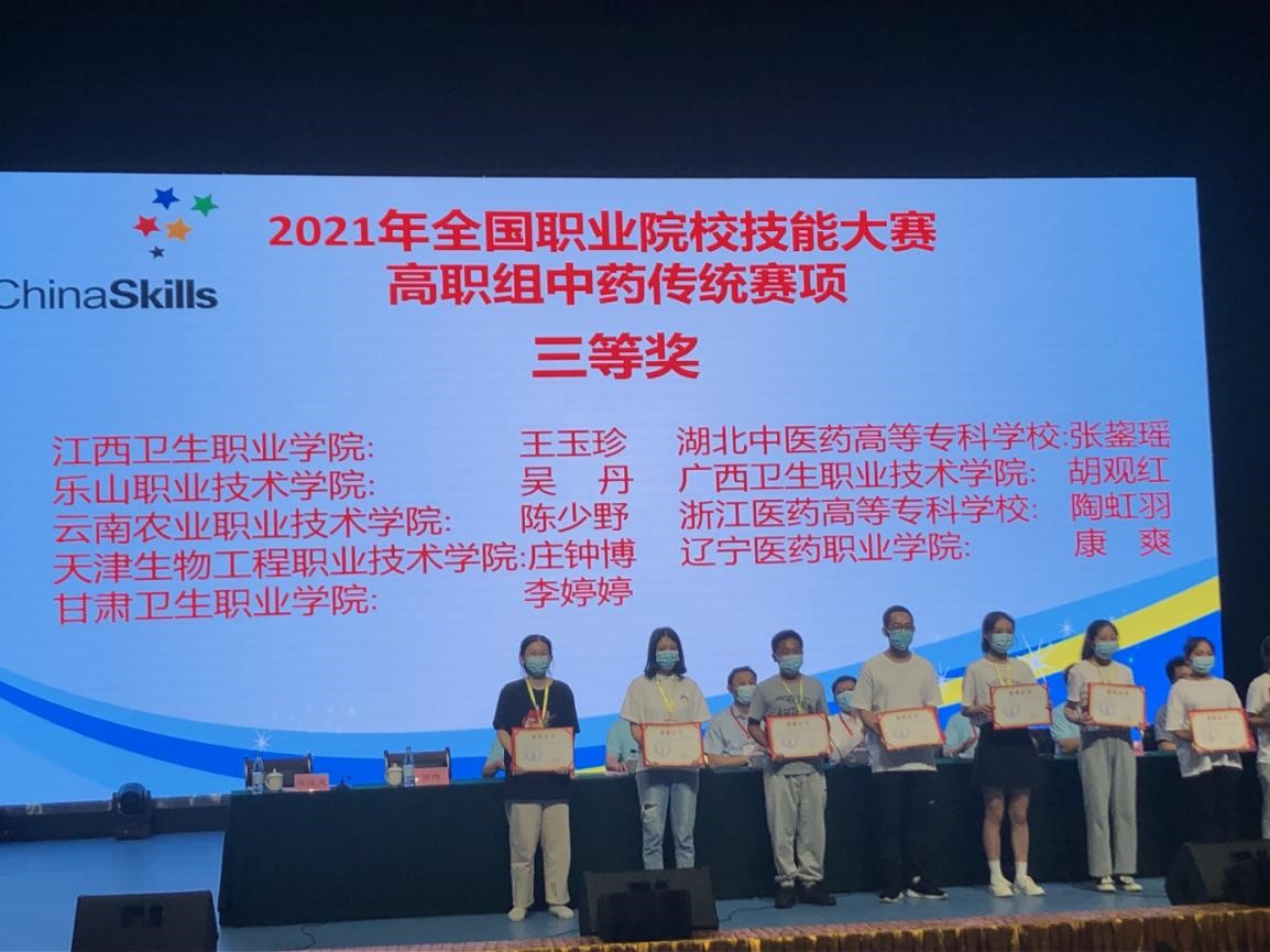 通知中心2021年全国高职院校技能大赛高职组“中药传统技能”赛项于2021年6月22—25日在重庆三峡医药高等专科学校隆重开赛,全国29支代表队29名参赛选手齐聚重庆万州。我院食品药品与大健康学院2019级中药学专业陈少野同学代表云南省参赛,在本次大赛中获得三等奖。