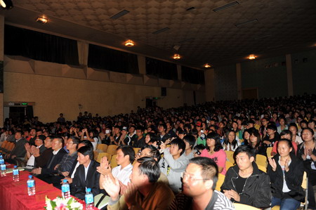 27日晚,小哨校区张灯结彩、喜气洋洋,大礼堂一千多座位爆满,过道、走廊、门口挤满了前来观看节目的2011级新同学。当学院党委书记崔金赋上台用三句诗一般的语言宣布庆国庆、迎新生暨第七届大学生文化艺术节晚会开幕时,全场热烈的掌声伴随耀眼的焰火拉开了晚会的序幕!