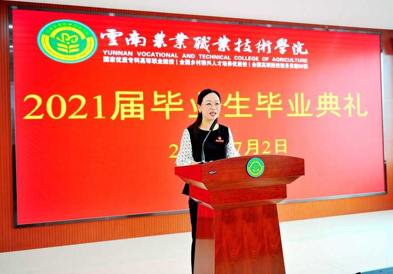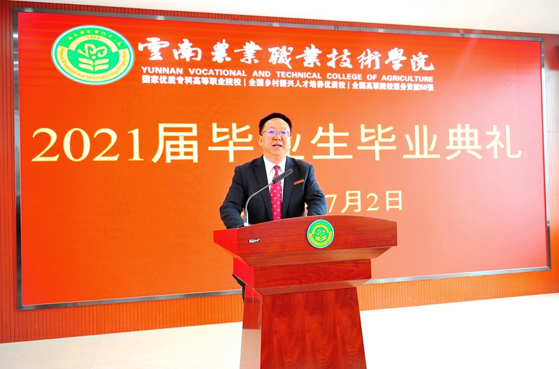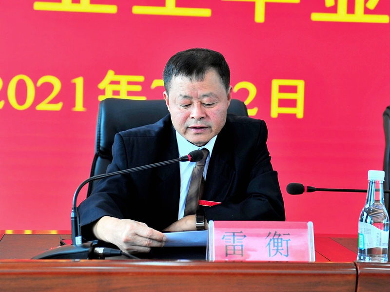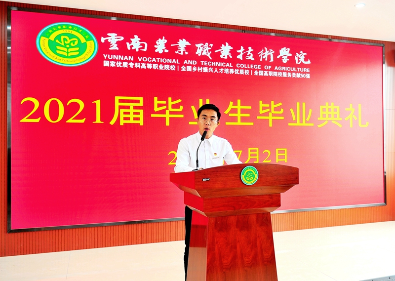 毕业典礼上,文俊院长代表学院向毕业生表示祝贺,并送上祝愿,文俊院长以一名师长和朋友的身份对毕业生寄以深切的希望和嘱托,把校训:”耕道、养德、理想、开拓”作为人生路上的礼物送给毕业生,他希望毕业生心怀敬畏之心,顺势而为,耕人生大道,希望同学常怀责任之心,甘于奉献,养天地之大德;希望同学们常怀坚定之心,百折不挠,坚定理想;希望同学们常怀进取之心,与时俱进,开拓创新,母校永远是毕业生的精神家园和坚强后盾。文俊院长回顾了学校的发展历程,对毕业生取得的成绩表示充分肯定,并以此为傲,他指出学校取得的成绩与毕业生的努力分不开,广大毕业生为学院发展搭建了更加广阔的平台。奋斗正青春,青春献给党,文俊院长叮嘱全体毕业生,要以习近平总书记在庆祝中国共产党成立100周年大会上的重要讲话精神为指引,把青春奋斗融入党和人民事业,以实现中华民族伟大复兴为己任,不负时代,不负韶华,不负祖国和人民的殷切希望。