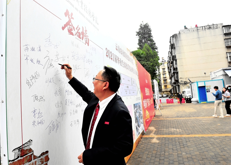 毕业典礼结束后,院长文俊带队实地查看了办理毕业生离校手续的现场,各有关部门负责人详细介绍了毕业生离校的办理程序和关键环节,文俊院长等学院领导与毕业生充分交心谈心,询问毕业生就业情况和需要学院解决、支持及帮助的情况,并亲切地与毕业生合影留念,共同在签名墙上留下自己的最美签名。