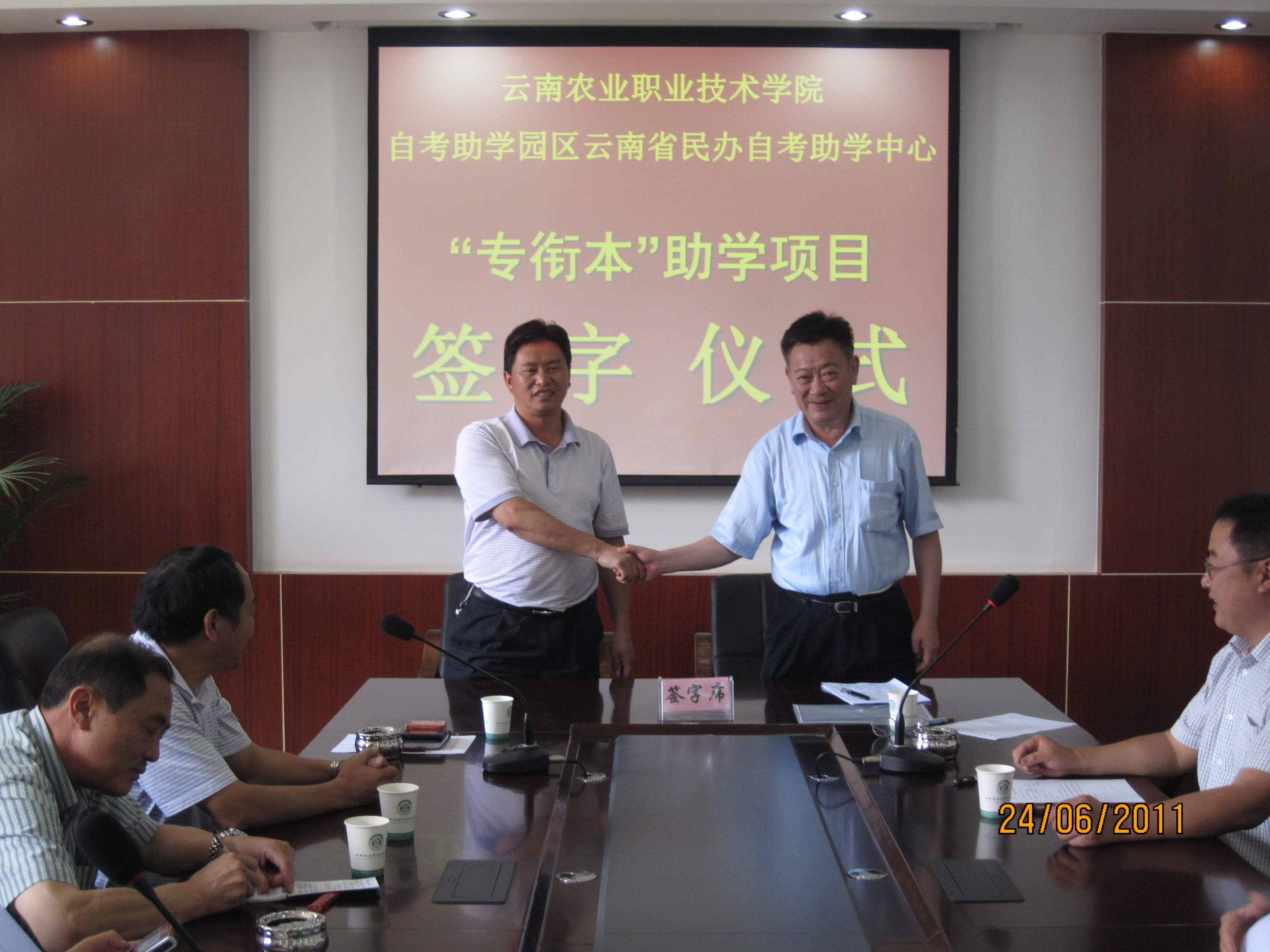 2011年6月24日上午10点,best365中国官方网站与云南省民办教育协会高等教育自学考试助学中心在学院茭菱校区行政楼四楼会议室举行“专科生自考衔接本科”助学项目签字仪式。会议由院长助理田应华主持,党(院)办主任凌军、对外合作交流处、教务处、宣传部有关人员以及四个教学系系主任参加了签字仪式。