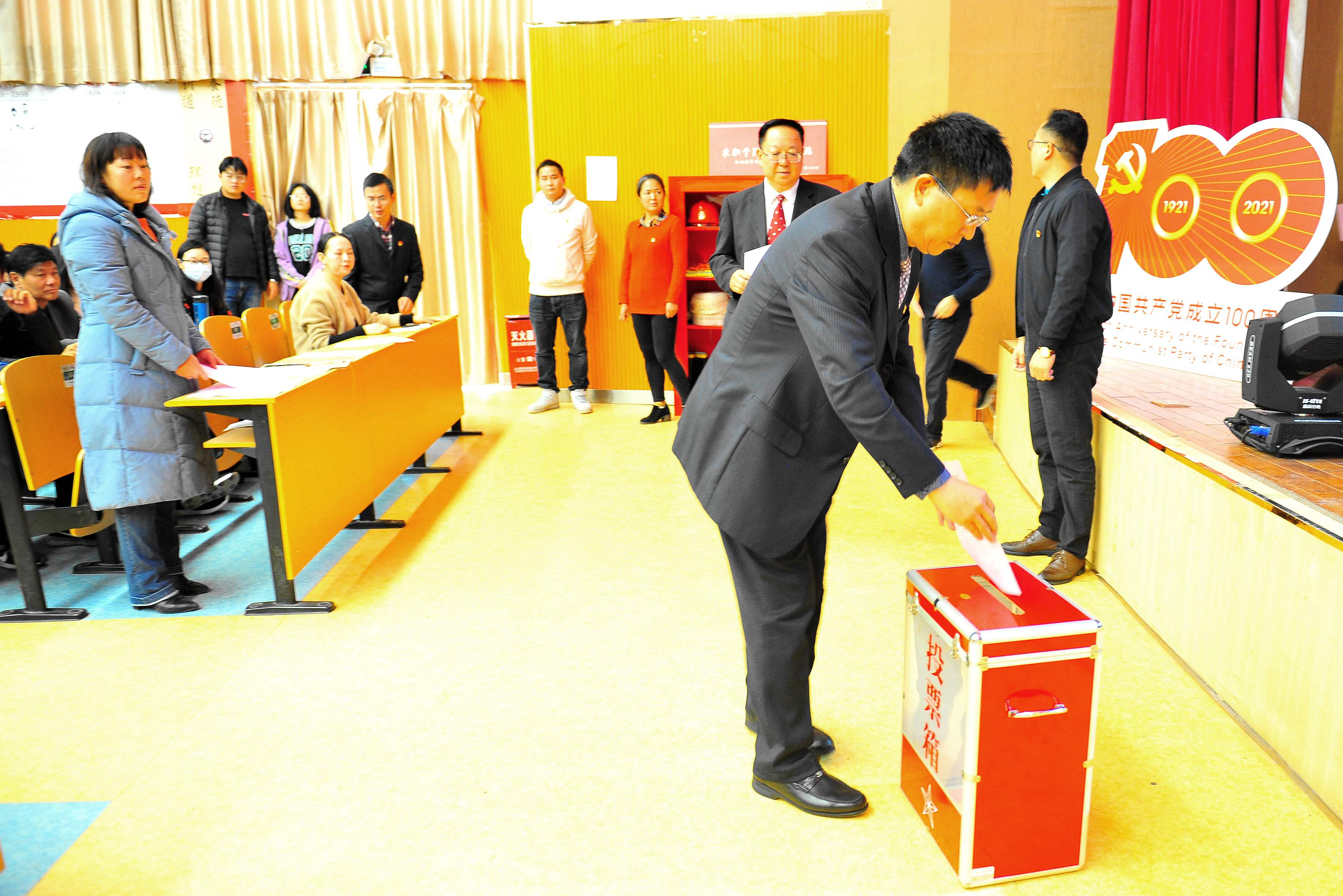 通过工作人员紧张而有序的统计,总监票人向大会报告了计票结果。主持人向大会宣布选举结果:大会选举文俊同志为学院出席省第十一次党代会代表。