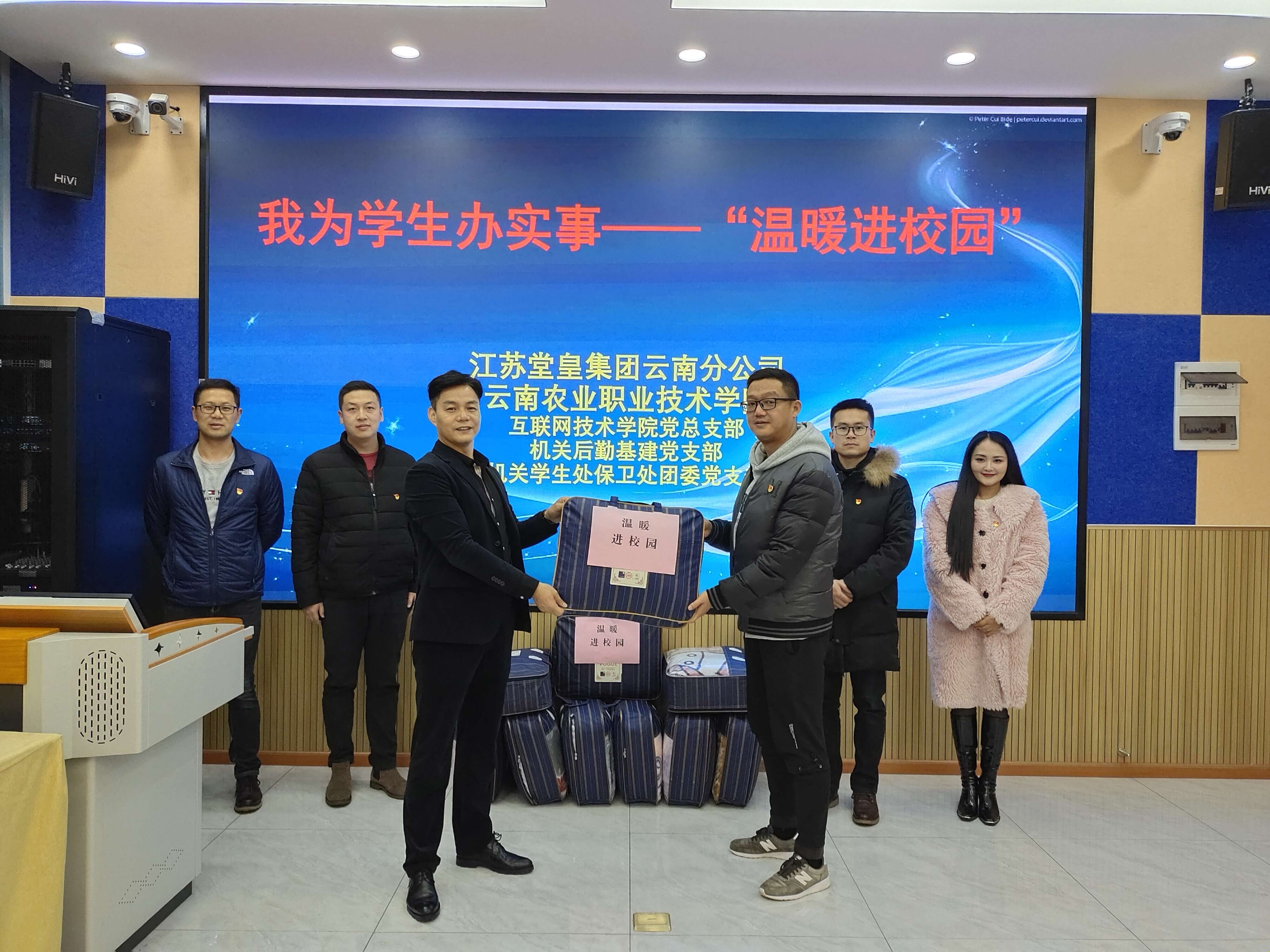 11月23日,“我为学生办实事——温暖进校园”捐赠仪式在茭菱校区举办,学生工作部(处)、后勤管理服务中心、团委、互联网技术学院党总支负责人及江苏堂皇集团云南分公司负责人参加了捐赠仪式。