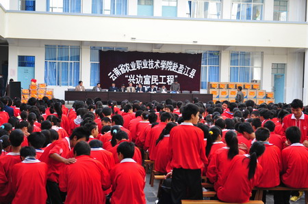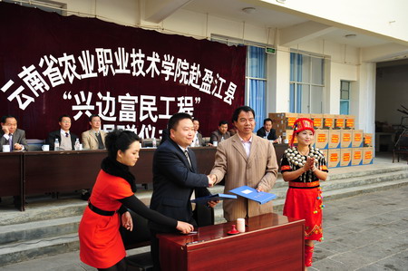 德宏州盈江县是云南省边疆少数民族贫困县,是我院在2008年云南省政府确定的第二轮对口帮扶“3+1兴边富民”对象。结合盈江县的特点及我院的办学优势,我院积极主动提出为盈江县免费举办养殖业培训班和种植业培训班,派出精兵强将重点培养种养殖大户,提高盈江县种植养殖户的科学种养殖水平,提升盈江县农业局、畜牧局技术人员的职业技能;同时,向盈江县职业中学赠送价值七万元的23台电脑,赠送三万元的科技图书,大力帮扶盈江县经济、教育的发展。(蔡永生 供稿)