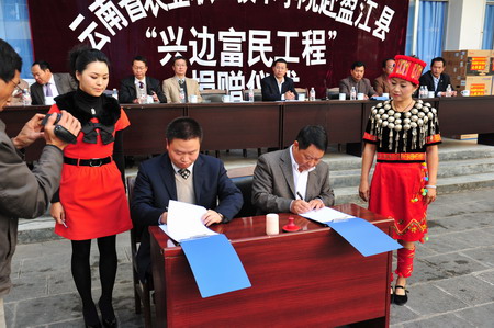 彭志远院长分别与盈江县高级职业中学杨校长、县畜牧局的领导在电脑图书“捐赠协议书”上签字,全场报以热烈的掌声!