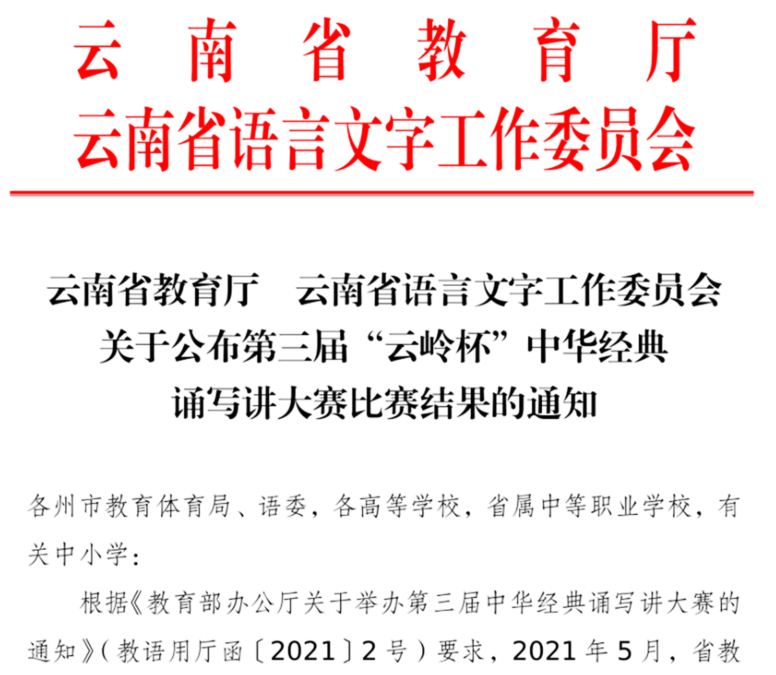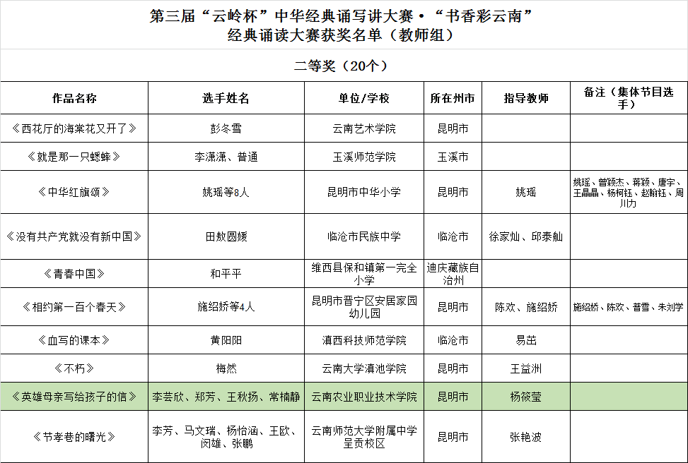 通知中心近日,省教育厅、省语委举办的第三届“云岭杯”中华经典诵写讲大赛系列活动公布了获奖名单,我院李芸欣老师、郑芳老师、王秋扬老师和常楠静老师的作品《英雄母亲写给孩子的信》获经典诵读大赛教师组二等奖;郑芳老师的作品《七一献诗》获经典诵读大赛教师组三等奖;李芸欣老师的作品《红色家书的百年信仰——浅析赵一曼写给儿子的信》获诗词讲解大赛大学教师组优秀奖。