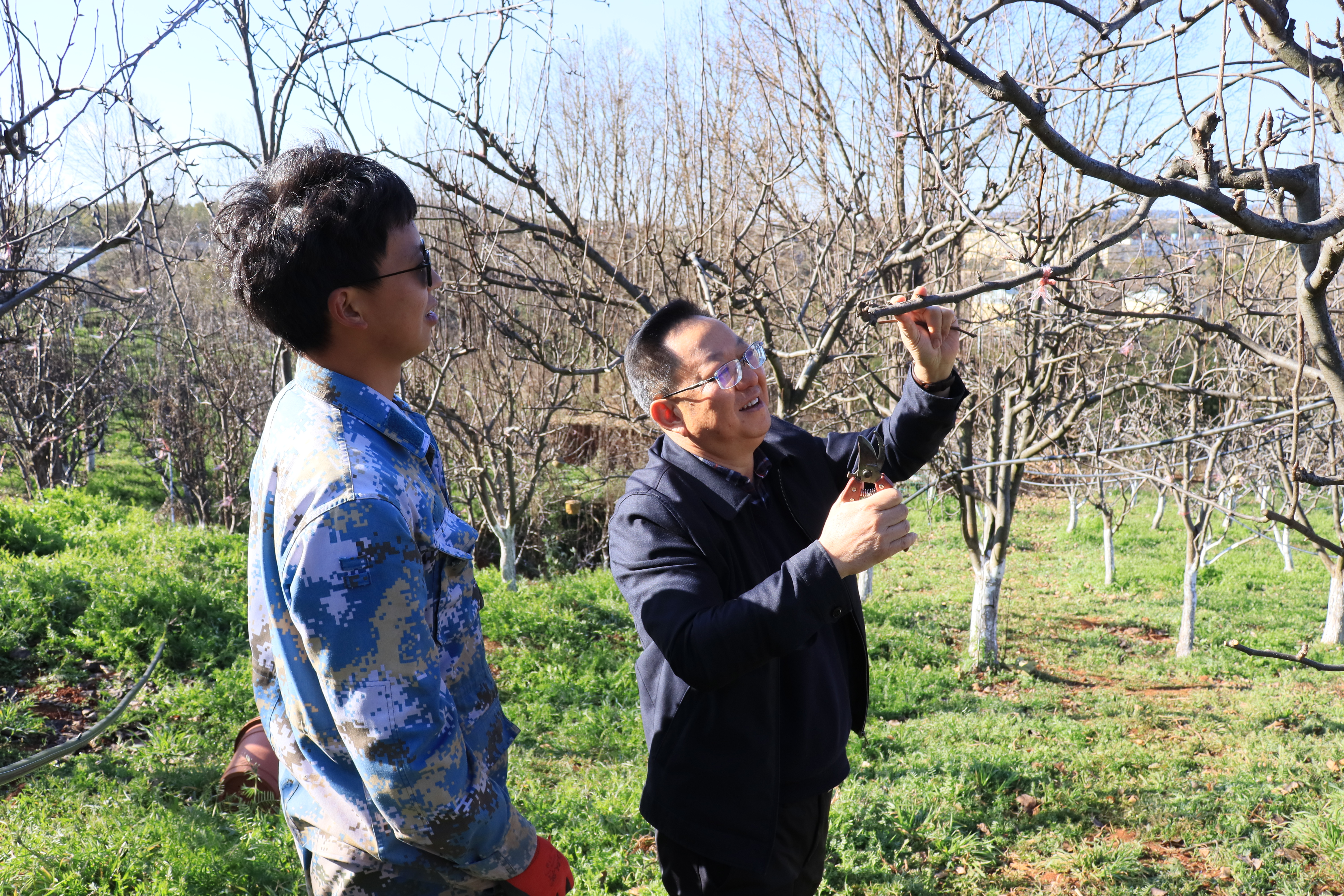 文院长与学生交流果树修枝